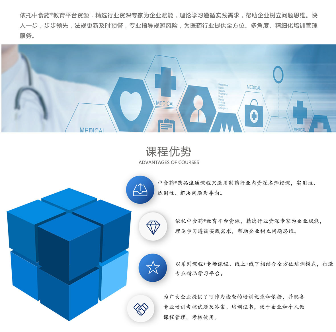 【概要描述】依托中食藥?教育平臺資源,精選藥品流通行業(yè)資深專家為企業(yè)賦能,理論學(xué)習(xí)遵循實(shí)踐需求,幫助企業(yè)樹立問題思維??烊艘徊?,步步領(lǐng)先,法規(guī)更新及時預(yù)警,專業(yè)指導(dǎo)規(guī)避風(fēng)險,為醫(yī)藥行業(yè)提供全方位、多角度、精細(xì)化培訓(xùn)管理服務(wù)。