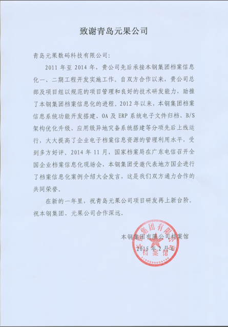 2015年2月,元果公司收到一張來(lái)自本鋼集團(tuán)的感謝信!